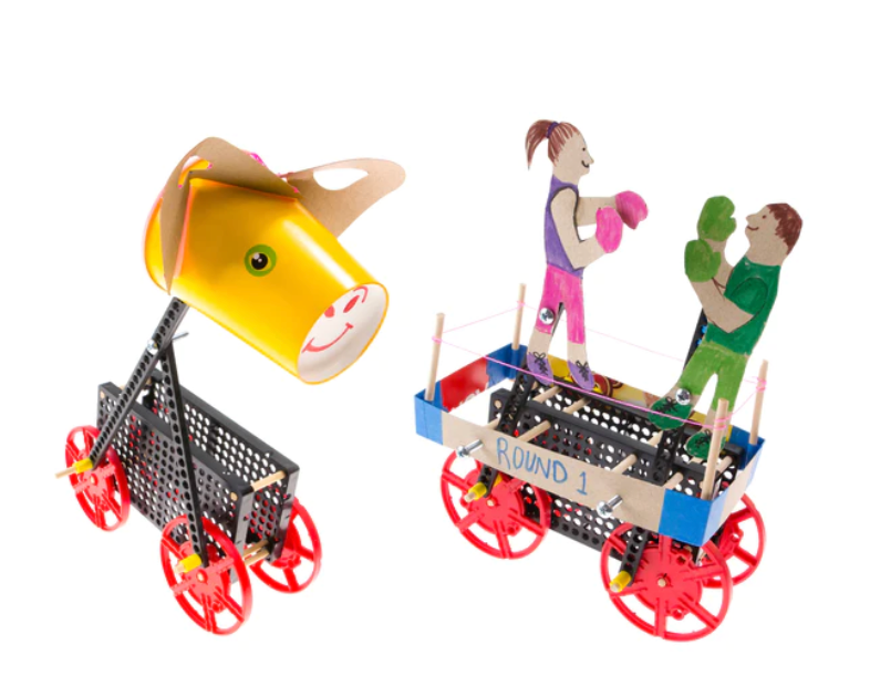 heads bob, hands wave or wrestlers 'wrassle'. Follow the engineering design process to brainstorm, construct, iterate and redesign innovative toys. Children will really build their toys, utilizing simple machines, linkages, kinetic and potential energy and mechanical advantage in their plans.